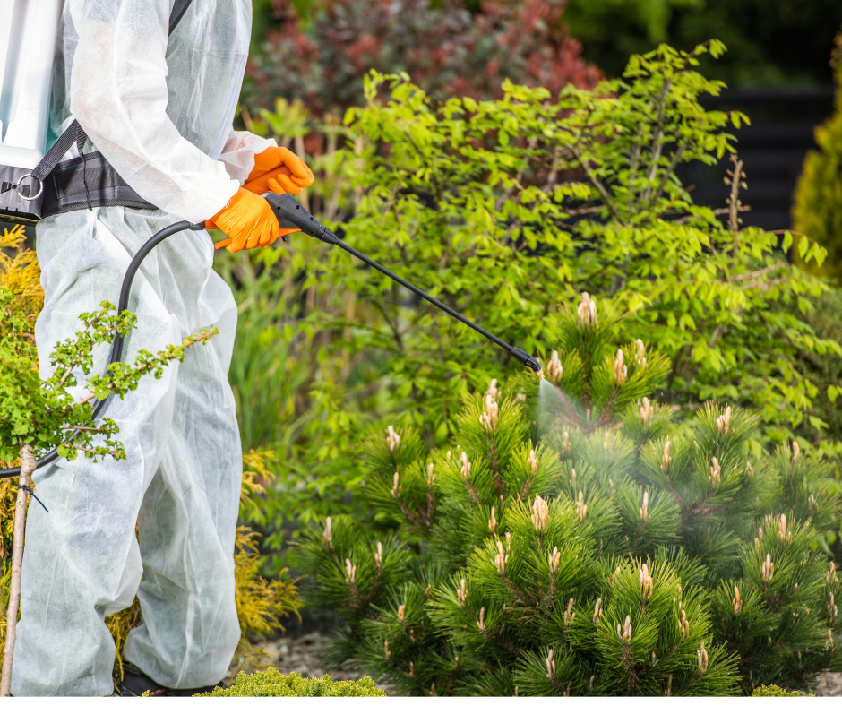 Spraying herbicide along buildings and fence lines to control weed growth and maintain a