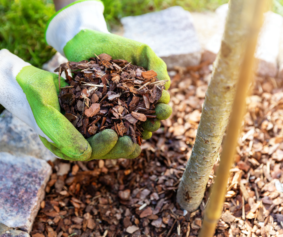 Adding mulch to existing mulch beds to conserve moisture, suppress weed growth, and